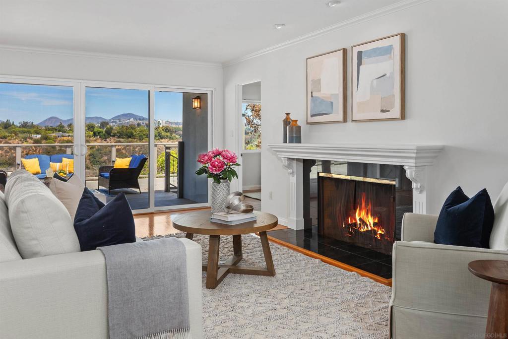 Nestled on a canyon lot, this airy and inviting Talmadge home offers panoramic views and beautifully landscaped front yard with excellent curb appeal. Step through the charming stained-glass front door into a formal entry, where your gaze is immediately drawn to the sweeping canyon beyond. Hardwood floors and warm wood trim flow throughout the home, complementing the cozy fireplace in the living room. The spacious primary suite features a recently remodeled bathroom blending comfort with modern style... Lovely kitchen offers abundant cupboard and counter space and eating bar, and opens to a cheerful breakfast room with a large picture window framing the canyon view. Sliding glass doors from the living room lead to an expansive deck, with a sleek plexiglass view through railing, perfect for entertaining. Additional highlights include a direct-entry garage (with Tesla wall charger) and thoughtful layout, ideal for both relaxed family living and lively gatherings.